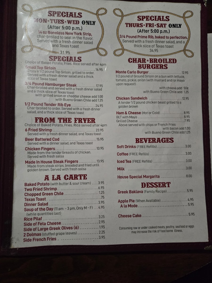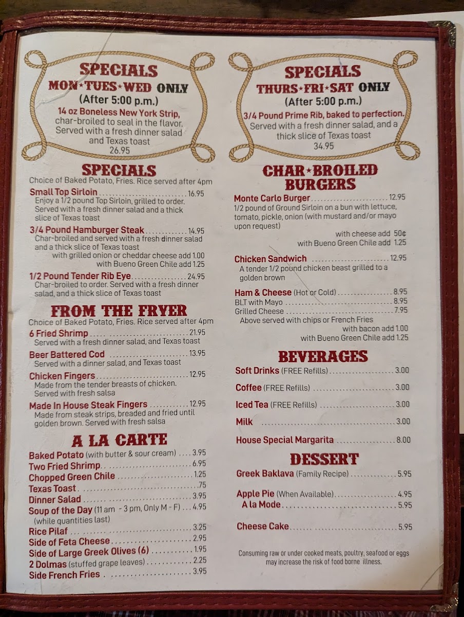 This is a great place to grab a burger or a steak. I’ve been here several times and food is consistently good. The service is always outstanding too. Really enjoy the cheeseburger with green chili. The restaurant also has a cool retro atmosphere. Highly recommend!